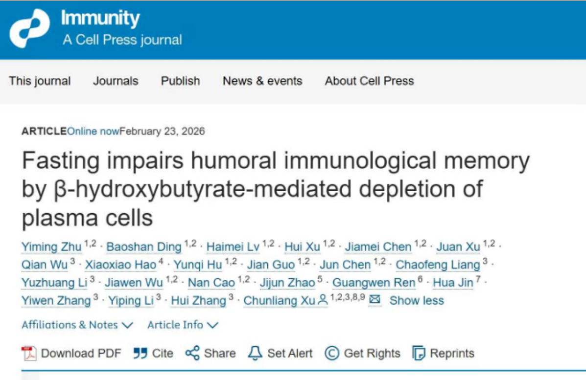 Immunity | 大陆娱乐城 徐春亮教授团队揭示禁食损害体液免疫记忆,削弱疫苗保护效果