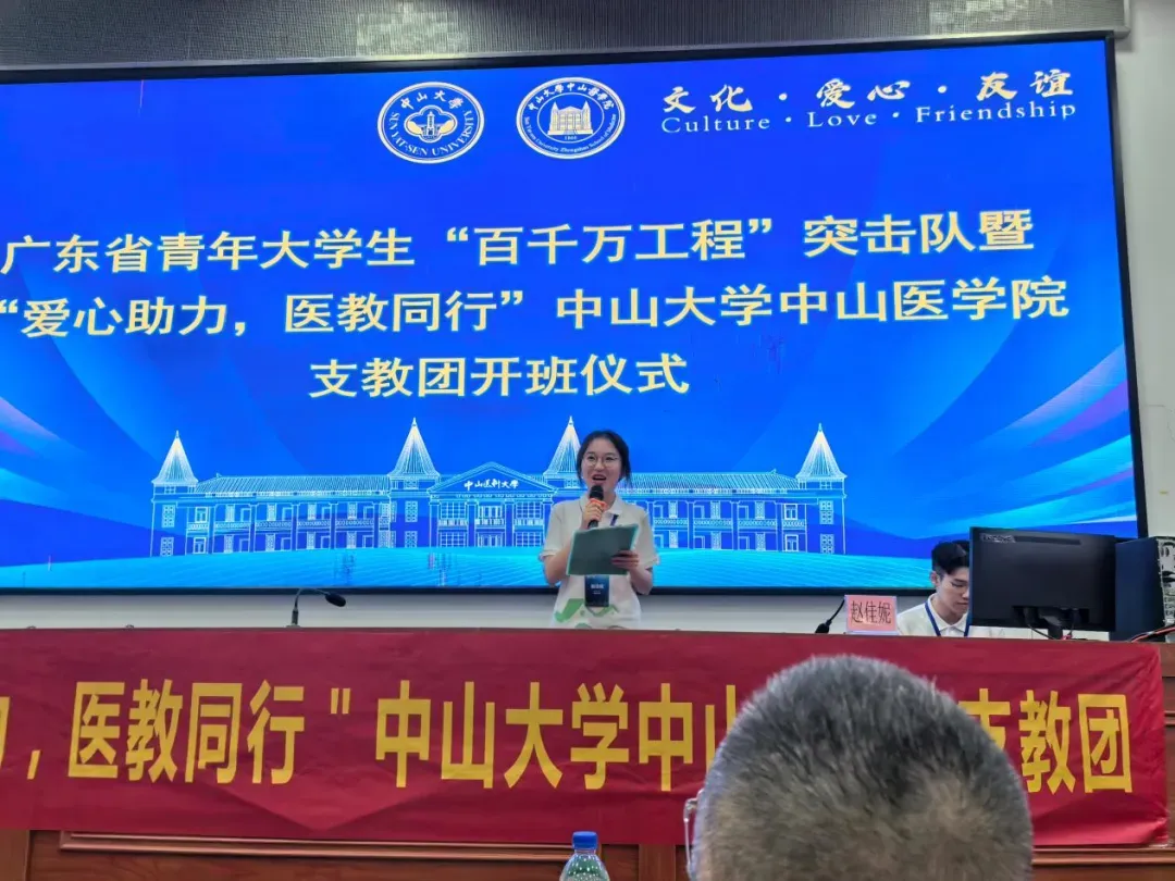 赵佳妮在广东省青年大学生“百千万工程”突击队暨“爱心助力,医教同行”大陆娱乐城(中国)官方网站 支教团开班仪式上发言