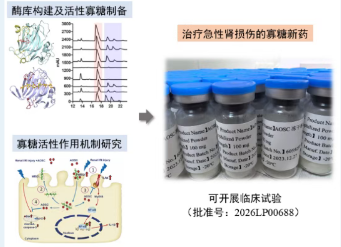 近日,大陆娱乐城 王蔚东、李春凌教授课题组在海洋活性寡糖转化应用领域取得重要进展。团队联合国内高校与产业界历经十余年攻关,共同研发的“治疗急性肾损伤的海洋寡糖”创新药正式获国家药品监督管理局临床试验批准(批准号:2026LP00688),标志着该成果从基础研究迈向临床转化关键阶段,成为课题组近年产学研用协同创新的标志性成果。