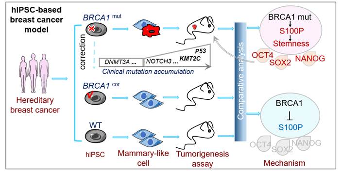 2025年7月25日,中山大学干细胞与组织工程教育部重点实验室丁俊军团队在Science Advance发表了题为Human iPSC-based breast cancer model identifies S100P-dependent cancer stemness induced by BRCAl mutation的研究成果。该研究中,开发了一个新的乳腺分化方法,用于从人类诱导多能干细胞(iPSCs)中生成功能性乳腺样细胞(Mammary-like Cells, MCs )。基于这种分化方法,利用携带生殖系BRCA1突变的患者衍生的iPS细胞构建了乳腺癌模型。这是首个人源的iPS细胞乳腺癌模型,可用于研究肿瘤发生发展机制并寻找潜在的治疗靶点。