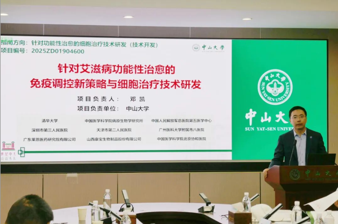项目负责人邓凯教授系统介绍了项目整体实施方案。该项目围绕艾滋病功能性治愈这一全球性难题,设立五个课题,以“激活—清除”双功能策略为主线,依托基因工程改造的CAR-T细胞技术,结合新型免疫调控手段,开展从作用机制、产品研发到临床验证的全链条研究,重点突破病毒潜伏库激活与清除、细胞治疗产品开发、临床联合治疗等关键问题。