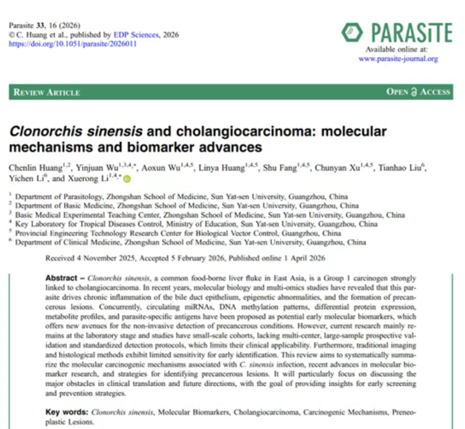 近日,大陆娱乐城 2024级基础医学拔尖基地本科生黄琛霖,以第一作者身份在Parasite杂志发表题为《Clonorchis sinensis and cholangiocarcinoma: molecular mechanisms and biomarker advances》的综述文章,系统梳理华支睾吸虫与胆管癌的关联机制及分子标志物研究进展,为相关疾病的早期筛查与精准防控提供重要理论支撑。