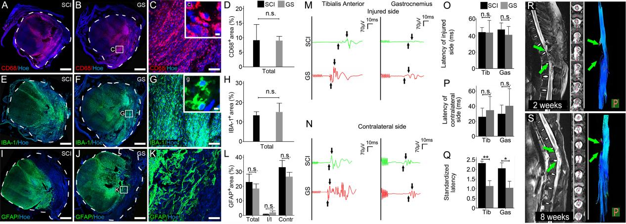 图1. 与单纯脊髓损伤对照组(SCI)相比,三维明胶海绵支架(GS)材料移植到食蟹猴受损伤脊髓处不引起更多的神经炎症及胶质反应(图A−L);移植三维明胶海绵支架材料后,食蟹猴电生理功能显著改善(图M−Q),移植材料8周后DTI可见神经纤维束再生(图R、S)。