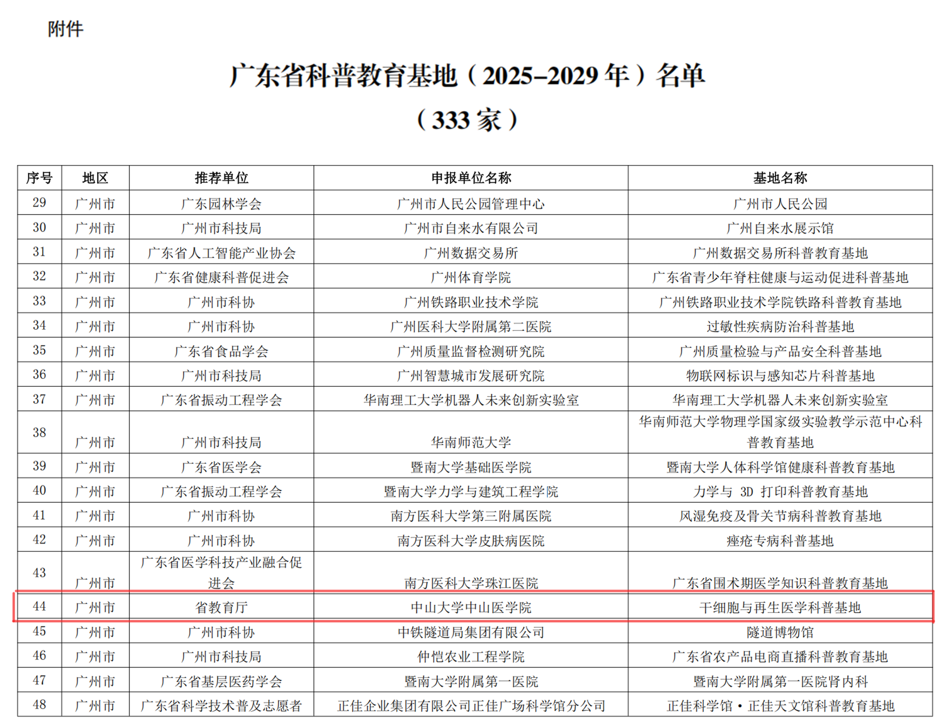 喜报!中山大学干细胞与再生医学科普基地获评广东省科普教育基地