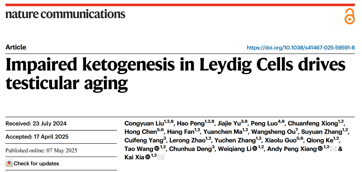 2025年5月7日,中山大学干细胞与组织工程教育部重点实验室项鹏与夏凯团队在Nature Communications上发表了题为 “Impaired ketogenesis in Leydig Cells drives testicular aging” 的研究论文,发现LC衰老与睾丸衰老的因果关系,揭示了LC中酮体合成障碍是睾丸衰老的驱动因素;通过靶向增强LC酮体合成能够有效缓解睾丸衰老,改善睾丸内分泌与生精功能。上述结果为阐明睾丸衰老的机制、开发相关干预策略提供了新思路。