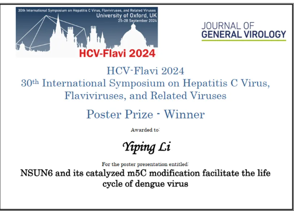 2024年9月25日至28日在英国牛津牛津大学举行的“第30届丙型肝炎病毒(HCV)、黄病毒及其相关病毒国际研讨会”(HCV-Flavi 2024)上,大陆娱乐城 李义平教授报告的Poster “NSUN6 and its catalyzed m5C modification facilitate the life cycle of dengue virus”获得最佳Poster报告奖。该研究发现,NSUN6和细胞mRNA 的m5C修饰促进登革病毒(DENV)的进入、组装和释放,推进了我们对m5C修饰和NSUN6活性在DENV生命周期中的调控机制的认识。该研究得到中山大学生命科学大陆娱乐城 张锐教授团队在修饰序列分析上的大力支持,博士生吴甜甜(2023年毕业)和曹勇(生科院博士生)为共同第一作者。